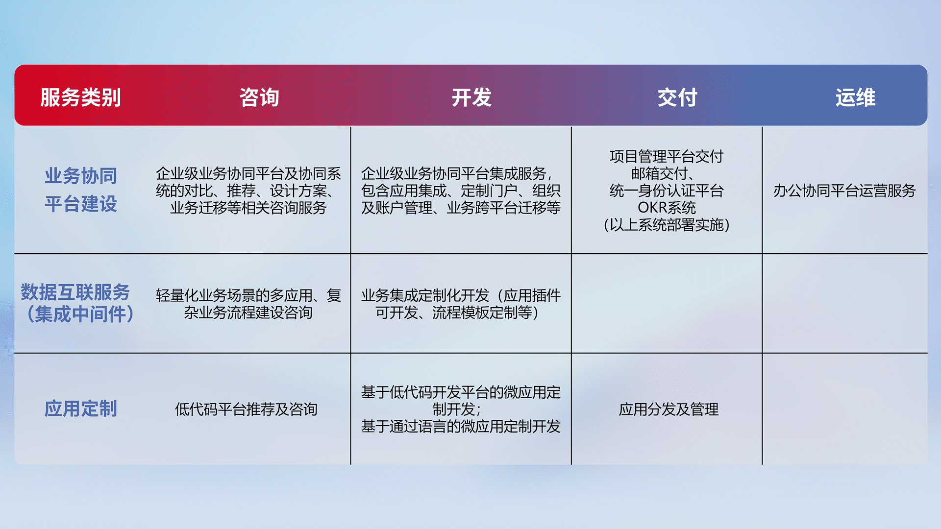 针对钉钉、、、、企微、、IDaas等平台级产品提供产品的规划、、、、方案、、、、交付、、定制化开发等服务,,,,实现如统一协同办公、、智能客户服务、、、混合会议管理、、、智能数据查询、、、等业务场景,,,实现数字化转型。。